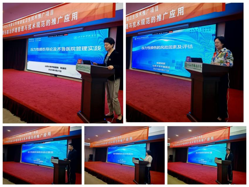 山东大学齐鲁医院多位专家围绕压力性损伤核心议题进行系统讲解:普外科护士长张温花解读《压力性损伤导论及院内质控管理》,甲状腺外科护士长相里晓颖详解《压力性损伤评估》,ICU副护士长王成涛阐述《压力性损伤预防之体位变换管理》,神经重症护士长孔娟分析《器械相关压力性损伤》,胃肠外科护士长楚亚丽讲解《压力性损伤治疗》。专家们的授课内容紧扣临床实践,兼具理论深度与实用价值,为参会者构建了压力性损伤防治的完整知识体系。