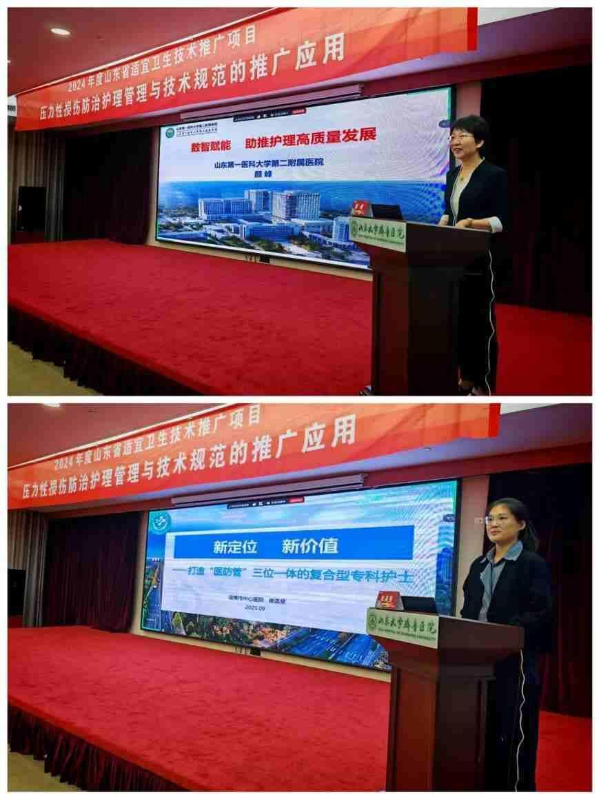本次培训班邀请多位省内护理领域专家,围绕压力性损伤防治及伤口造口护理前沿话题展开精彩授课。山东第一医科大学第二附属医院护理部副主任颜峰以《数智赋能 助推护理高质量发展》为题,探讨了智慧医疗背景下护理管理的创新路径,为护理信息化发展提供了新思路。淄博市中心医院护理部干事崔菡斐分享《新定位,新价值:打造“医防管”三位一体的复合型专科护士》,从专科护士角色定位出发,剖析了多维度能力培养的重要性。